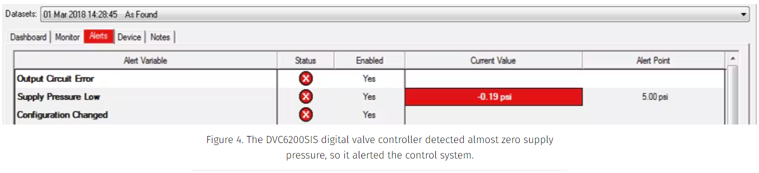 For example, a valve that is stuck open will exhibit itself as an increase in breakout force. Loss of seat load compared to when the valve assembly was new indicates potential valve leak. The Fisher DVC6200SIS also continuously monitors for internal faults as well as its inputs such as supply pressure. When the DVC6200SIS sees the supply pressure is too low, an alert is generated (Figure 4) so that the end user can take corrective actions.